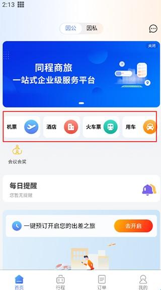4、登录后,在首页可以看到机票、火车票、酒店和用车的四个预约入口,选择需要的服务进行预约即可。