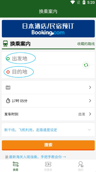 1、首先我们进入换乘案内app,在主页我们可以选择自己的出发地、目的地和出发时间,选择好后点击搜索。