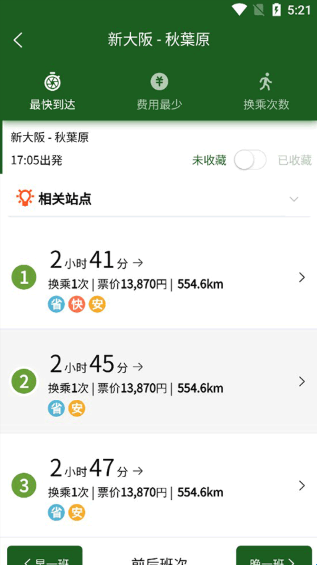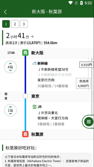 2、这里小编以从新大阪去往秋叶原为例,可以看见app给我们推送了3个方案,也将3个方案所需要花费的时间和购买的票价标识出来了。