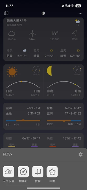 3、展示每天清晨和傍晚的蓝调和黄金时刻,我们细腻并原创性得把日出和日落时间点也显示在示意时间条当中,直观好分辨。