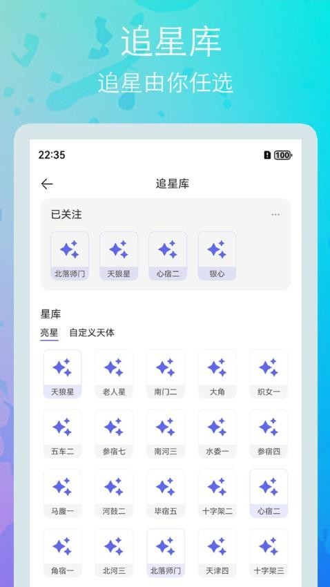 2、追星库:为你提供了许多的星座信息,你可以添加感兴趣的星座,以便你掌握最佳的拍摄位置和时间。