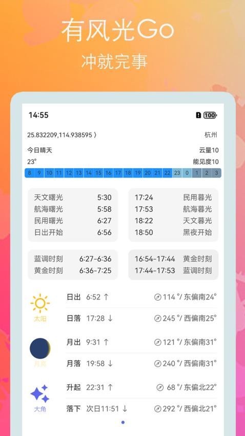 3、时间安排:可以根据软件提供的各种资料内容,用户就可以按照最佳的摄影时间了。