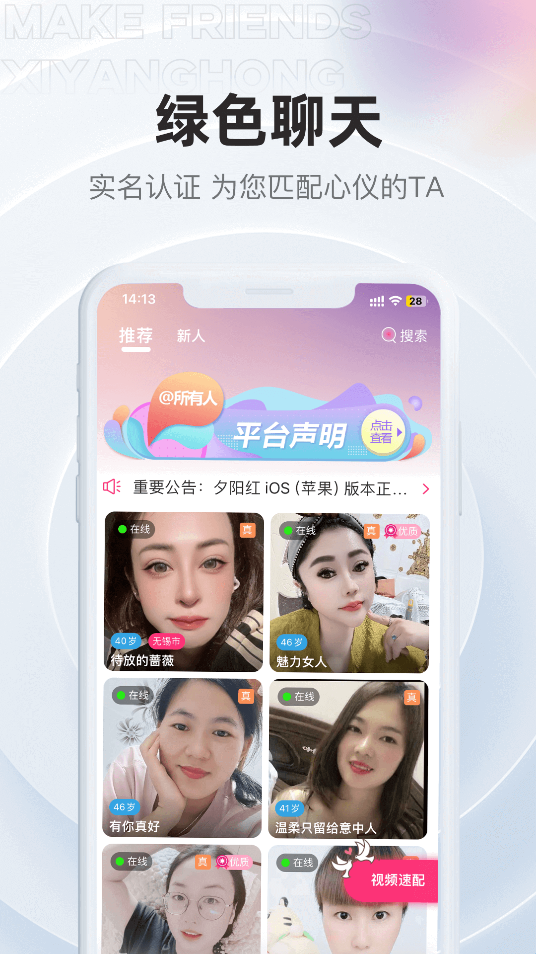 1、平台严格审核,真人认证即可放心聊天,夕阳红没有机器人陪聊,信息真实可靠,拒绝虚假用户