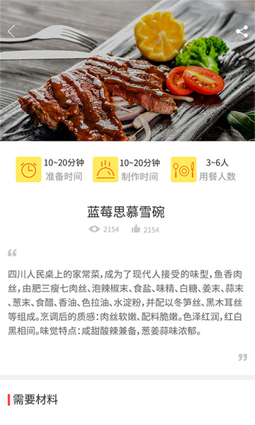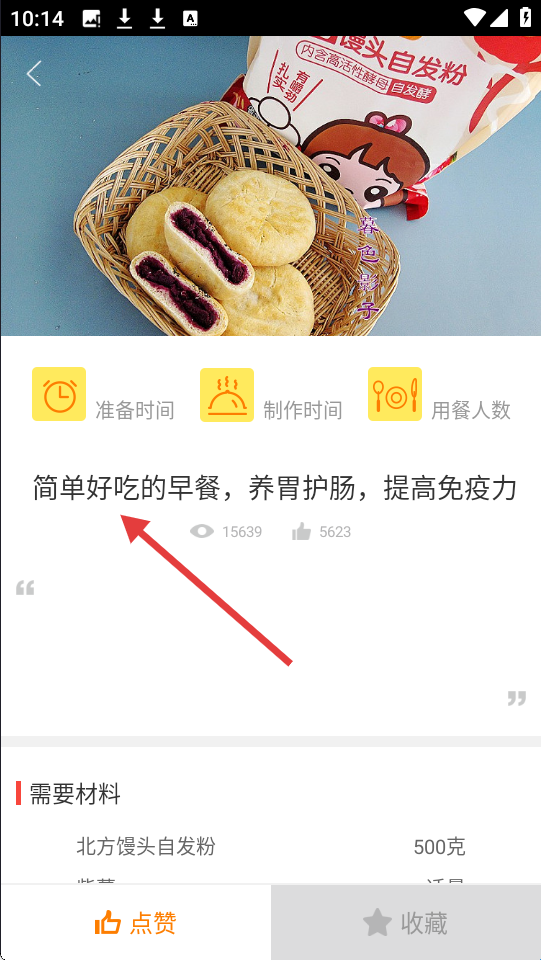 3、菜谱页面呈现美食图片,标注准备和制作时间等,有食材明细,如北方馒头自发粉等下方有点赞和收藏功能。