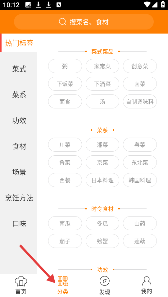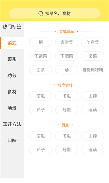 2、分类页面设热门标签,从菜式菜系到功效等维度分类,菜式含粥、家常菜等,菜系覆盖川菜西餐等多种类别。