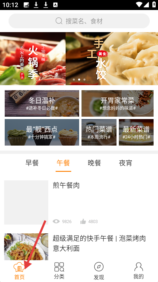 1、首页有搜索栏展示火锅季、手工水饺等专题,分冬日温补等板块,还有早午晚餐推荐如煎午餐肉等。