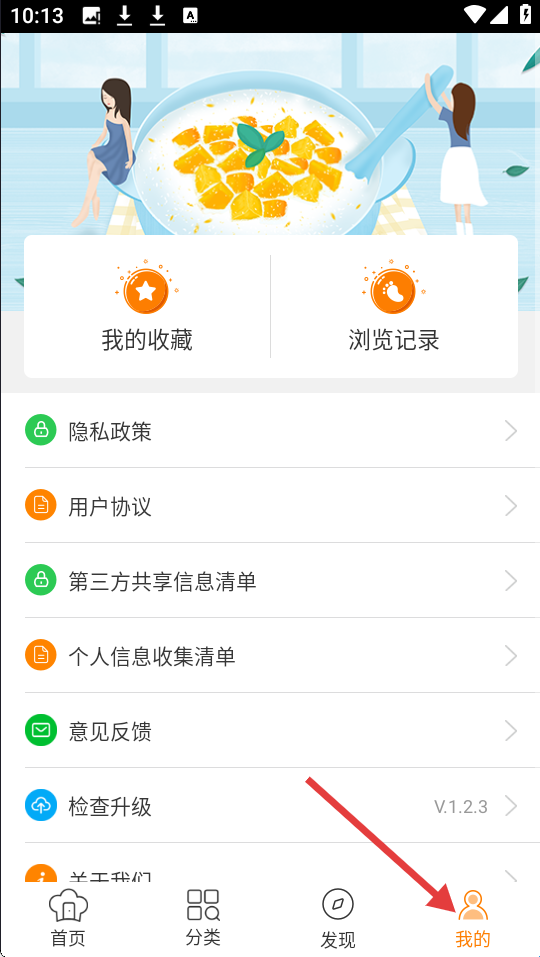 4、我的页面含我的收藏、浏览记录,还有隐私政策等选项,可进行意见反馈、检查升级等操作管理个人相关设置。