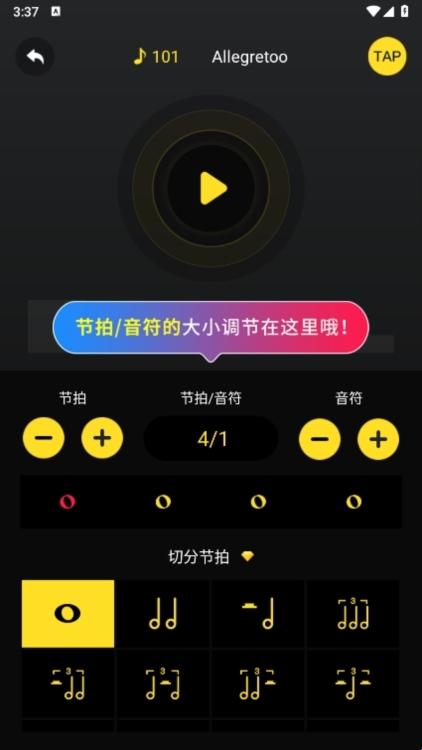 细分节拍功能可细化每拍内的节奏型(如八分音符、三连音),需在设置中开启“显示专业细分节拍入口”。