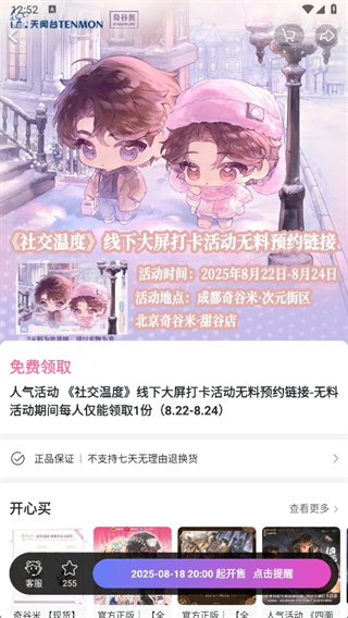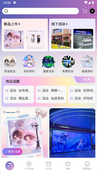 2、首页推荐了超多谷子,有新品、周边、预约、漫展活动、画展预约等等。