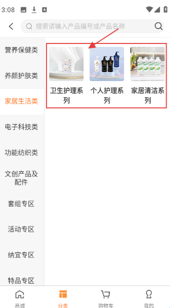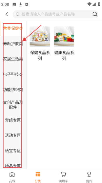 1、在分类页,有营养保健类、养颜护肤类等分类,选【养颜护肤类】,进入对应品类页。