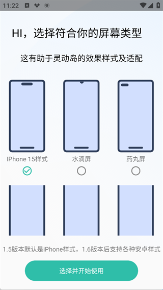 1、打开万象灵动岛App,先选择符合你的屏幕类型,这有助于灵动岛的效果样式及适配。