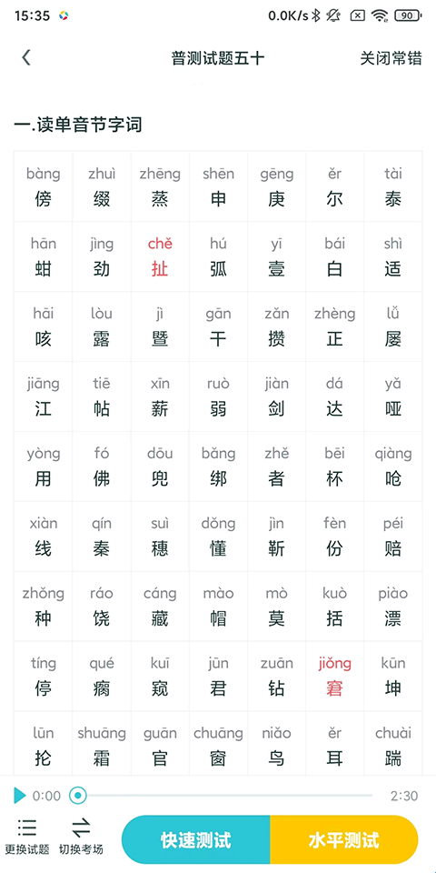 4、针对性发音练习:每套测试均附带拼音与专业音频练习,可录制自己音频对比进行提升,确定薄弱的专题模块,为后续的普通话水平提升做好准备。