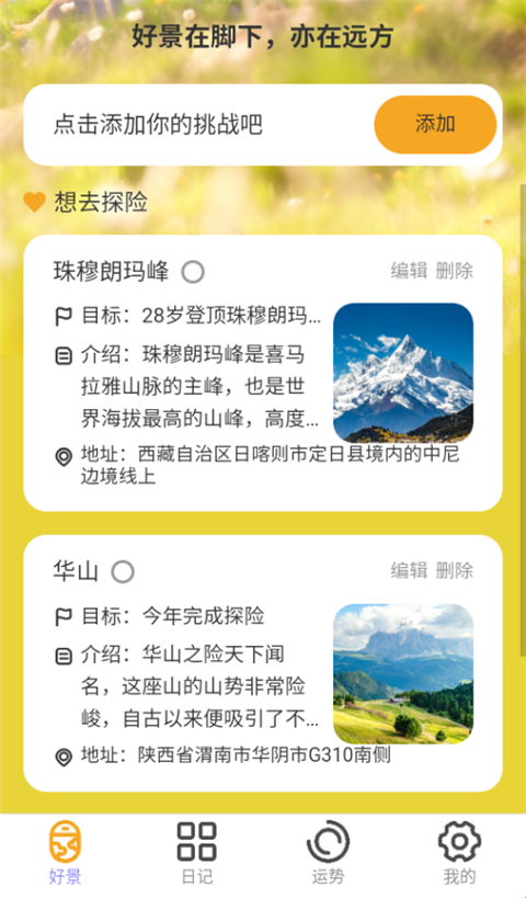 1、好景充充app能把自己想要挑战或者想要去旅游的地点提前记录下来,打造自己的打卡攻略。