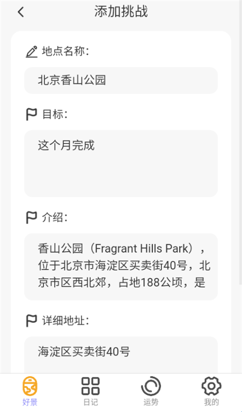 2、点击添加之后输入想要去的地点、目标、以及介绍等、