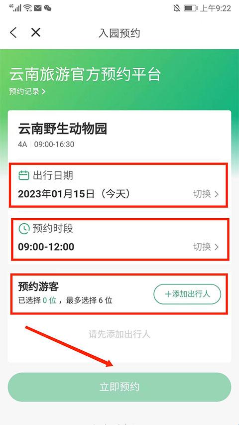 4、填写好“出行日期”、“预约时段”和“预约游客”等信息后,选择下方“立即预约”,
