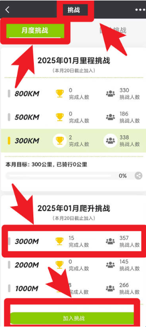 5、在“挑战”页面选择月度挑战,查看不同目标的完成情况并点击“加入挑战”参与活动。