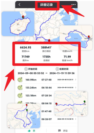 3、在“详细记录”页面中可查看总里程、骑行用时、平均速度等数据,并按时间查询历史骑行轨迹。