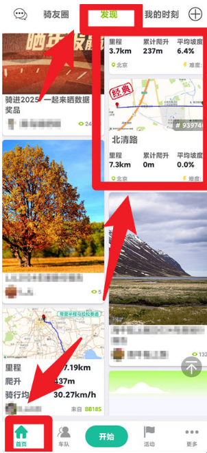 2、进入首页点击“发现”查看骑友动态,可浏览图片、路线及他人分享的骑行内容。