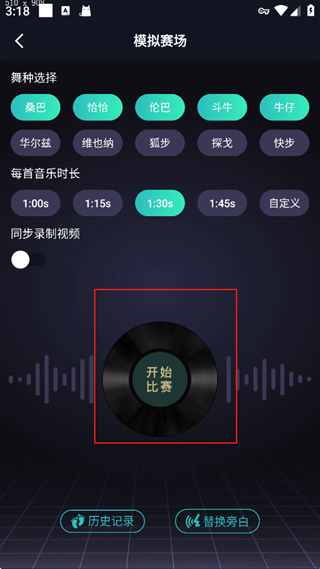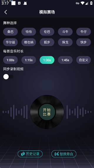 举个例子,如果你想进行拉丁全舞种的模拟与练习,那么就可以将【桑巴】、【恰恰】、【伦巴】、【斗牛】、【牛仔】全部选中(点亮即选中),之后从1min-3min区域中任意选择时长即可。