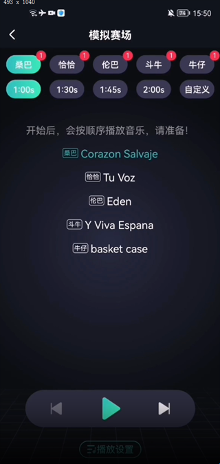 点击此处即可开始模拟比赛,如果此时你想要更换音乐/顺序,点击下方【播放设置】即可重新定义更换。