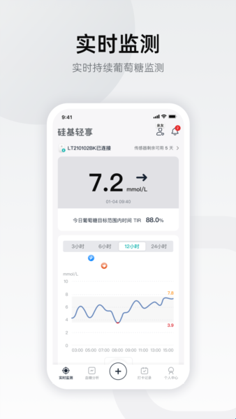 硅基轻享血糖仪是一款可以帮助监测血糖的健康助手软件,通过佩戴的硅基轻享发射器和探头了解你的实时血糖情况,跟踪血糖波动数据等,记录饮食运动药物等,平台还可以支持高低血糖提醒,亲友血糖远程共享,蓝牙实时信息传输等功能,帮助糖尿病患者更好的进行控糖管理,让你可以更加了解自己身体的健康,帮助用户平衡身体状态。