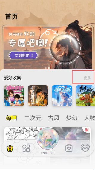 1、点击爱好收集右侧的更多按钮,进入爱好收集完整页面。
