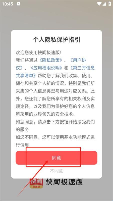 1、下载快闻极速版APP,点击同意个人隐私保护指引。