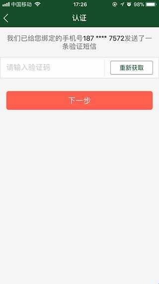 3、输入验证码后,点击下一步完成认证。