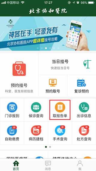 1、在APP首页点击【取报告单】。