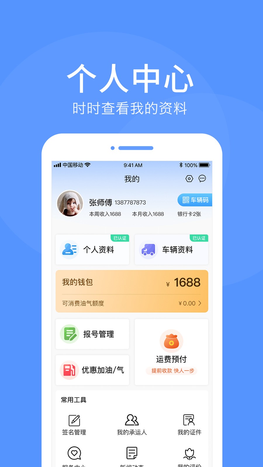 6、资料信息:通过应用来对个人呢资料以及车辆资料信息管理,修改相关资料信息。
