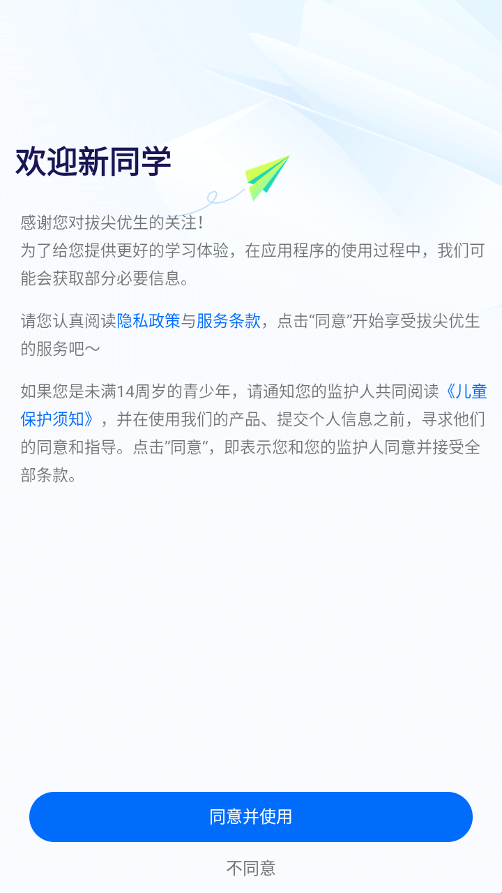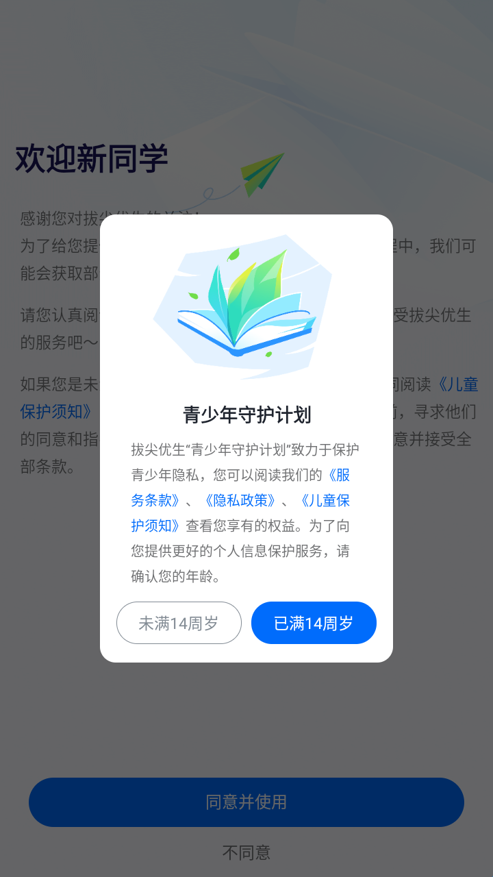 1、请您认真阅读隐私政策与服务条款,点击“同意"开始享受拔尖优生的服务吧。如果您是未满14周岁的青少年,请通知您的监护人共同阅读《儿童保护须知》,并在使用我们的产品、提交个人信息之前,寻求他们的同意和指导。点击”同意“,即表示您和您的监护人同意并接受全部条款。