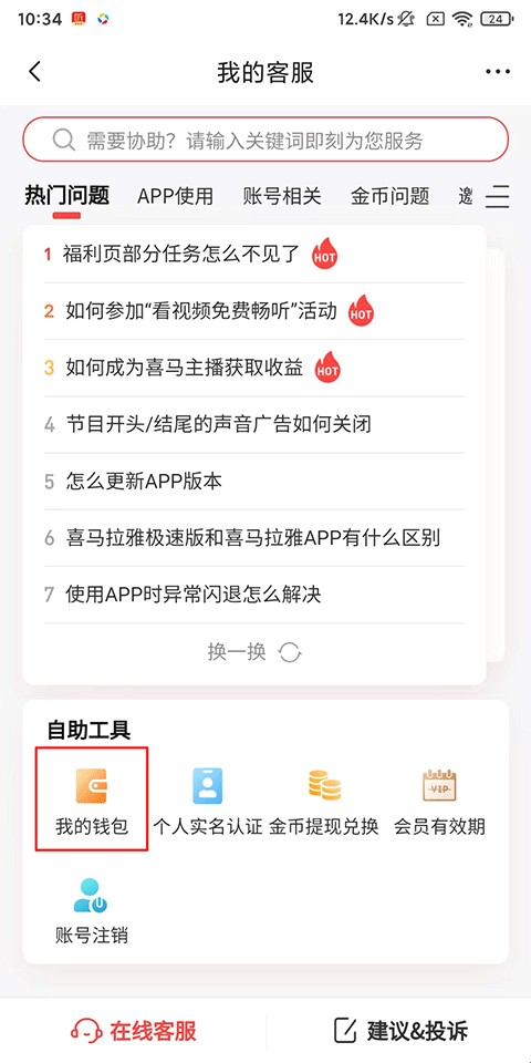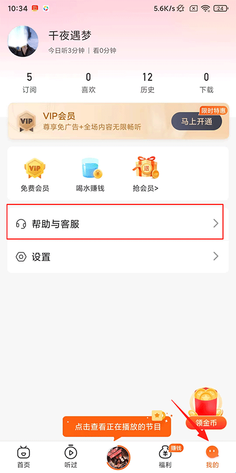 1、打开喜马拉雅极速版APP,点击我的-帮助与客服;
