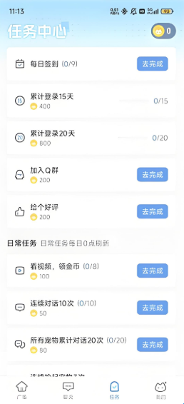 3、进入主页登录注册后,签到做任务领取金币,兑换喜欢的宠物。