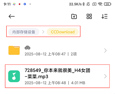 6、最后下载的舞曲也可以在手机【文件】-【内部存储设备】-【CCDownload】中找到。
