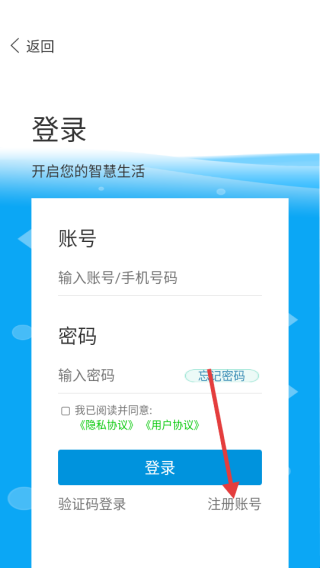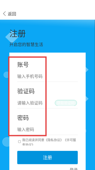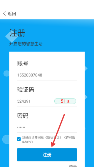 3、点击【注册】按钮,完成账号注册,即可登录APP开启智慧生活体验。