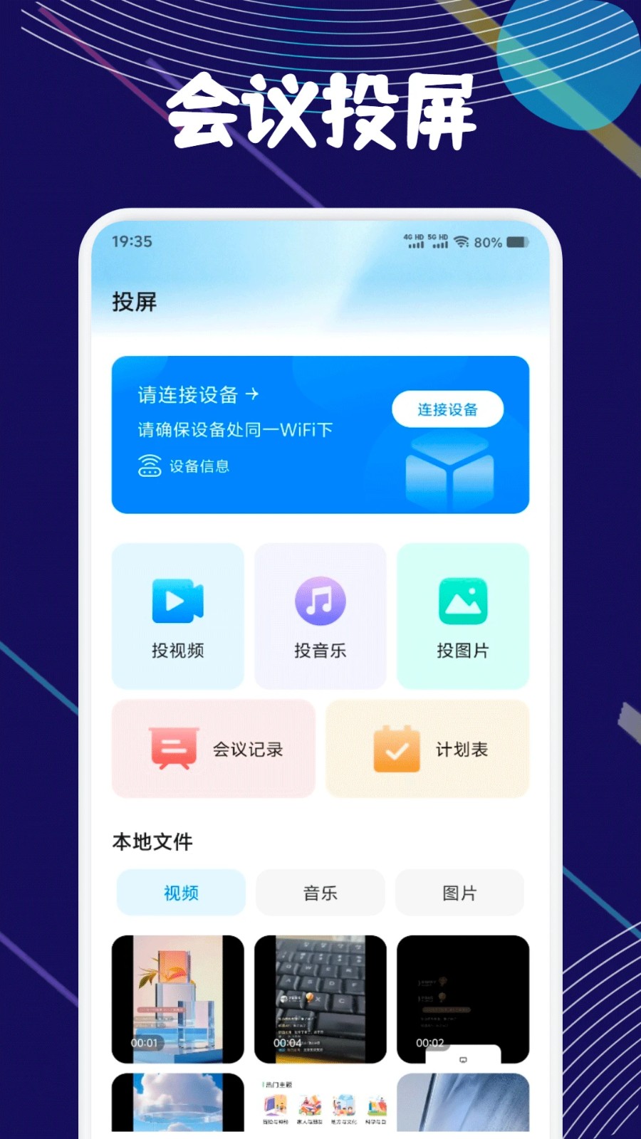 链上会议是一款用于办公的视频会议软件,覆盖商务会谈、同事交流、面试沟通、会务对接等多场景,直接查阅并复制使用,帮助提升商务沟通情商。用户只需将软件与投屏设备连接同一WiFi即可完成绑定,无需复杂设置,可选择本地视频、图片、音乐等文件进行高清投屏,满足会议内容展示需求。