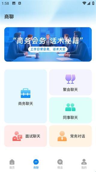 3、商聊板块有各种商务话术内容提供,可以掌握到更多的聊天技巧,随时便捷去互动的。
