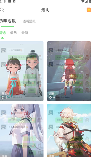 3、点击底部“透明”选项,这里全部都是透明的壁纸和皮肤,选择你喜欢的进行点击。