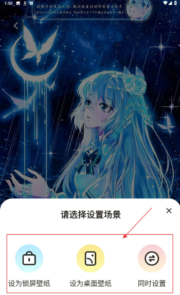 3、在弹出的设置场景中,按需选【设为锁屏/桌面/同时设置】,完成壁纸设置。