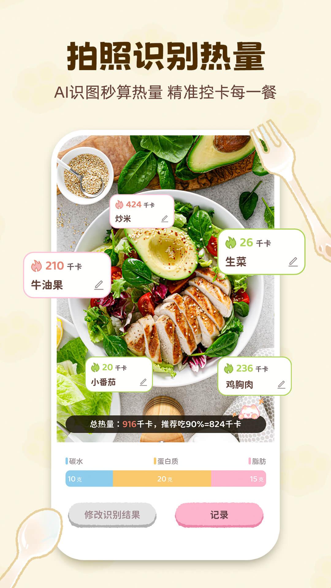 1.集成配方推荐、计划制定、进度跟踪、食物重量估算和数据记录等。