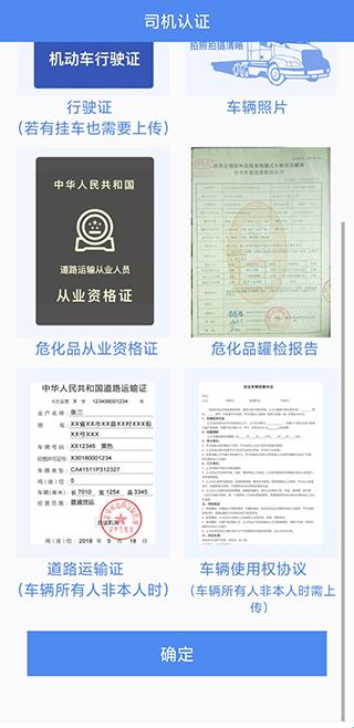 4、下一步,需要司机认证,需要准备以下材料:身份证、驾驶证、行驶证、车辆照片、危化品从业资格证、危化品罐检报告、道路运输证、车辆使用权协议。