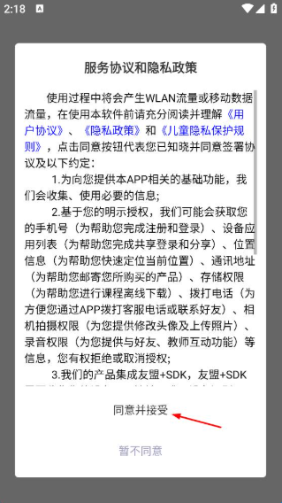 1、打开新华智慧校园App,在服务协议和隐私政策页面,点击“同意并接受”按钮。