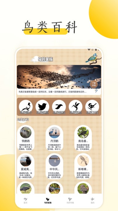 1、鸟类百科知识,用户了解各类鸟类的特点、习性等,增加鸟类知识的储备。