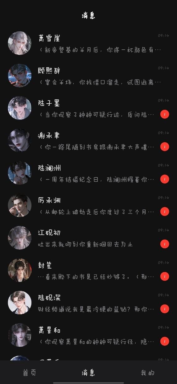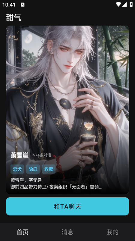 3、软件界面分为“首页、消息、我的”三大核心板块,首页展示角色列表与互动入口,消息栏查看历史对话,个人中心管理自定义角色,布局简洁直观。