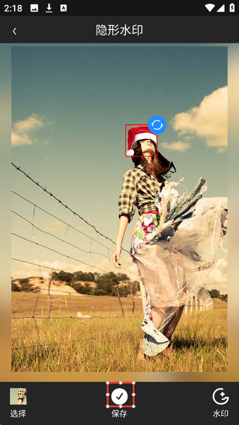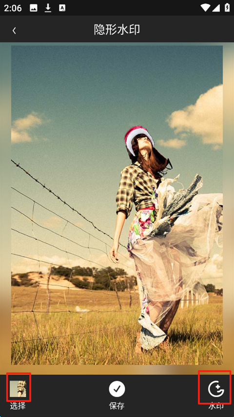 3、点击图片左下角的“选择”,可以选择需要添加隐形水印的图片,右下角可以选择需要的水印,有多种类型。