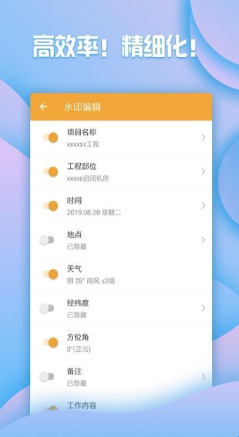内置工程项目名称、工程部位、时间、地点、经纬度、方位角、监理单位、施工单位、监测单位等一些列工程专用水印信息项目