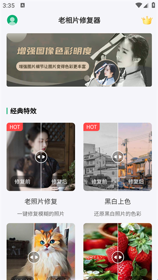 3、点击老照片修复,进入之后选择照片,就能一键修复;