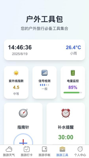 4、多功能工具包集成指南针、海拔测量、手电筒、分贝检测等十余种实用装备,全面满足户外活动中的基础需求与应急场景。