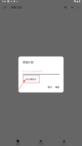2、在【添加计划】弹窗,点【点击设置更多】,展开计划详情配置。