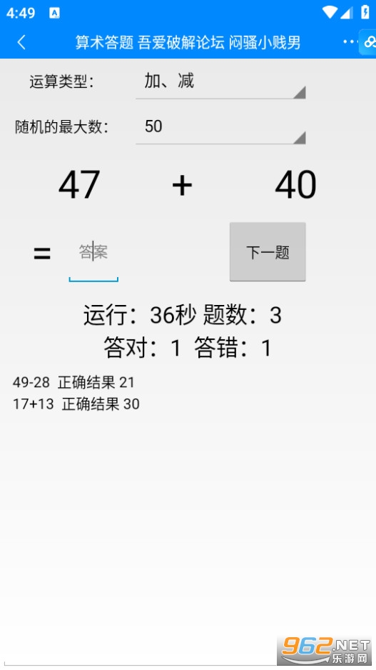 《算术答题》是一款考验用户快速反应的简单算术答题软件,用户可以在软件中设定答题题目数字范围以及答题难度进行相对的答题,然后在尽量短的时间内算出答案并在软件中打出,软件会记录用户每次答对和打错的题并将正确答案显示在下方,同时这款软件支持用户使用更高难度的数字范围以及加入更多的算法。
